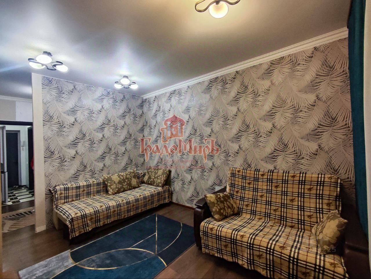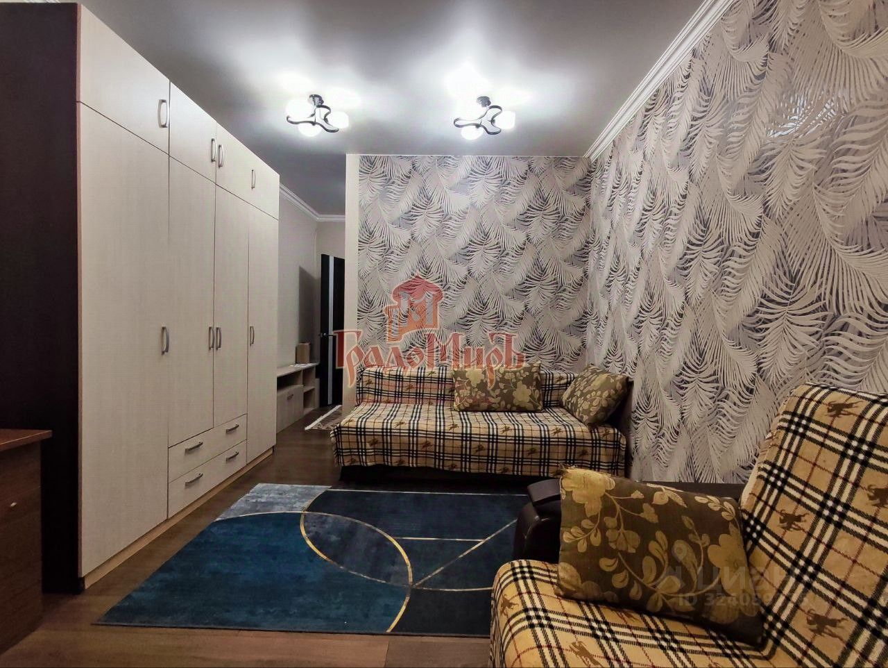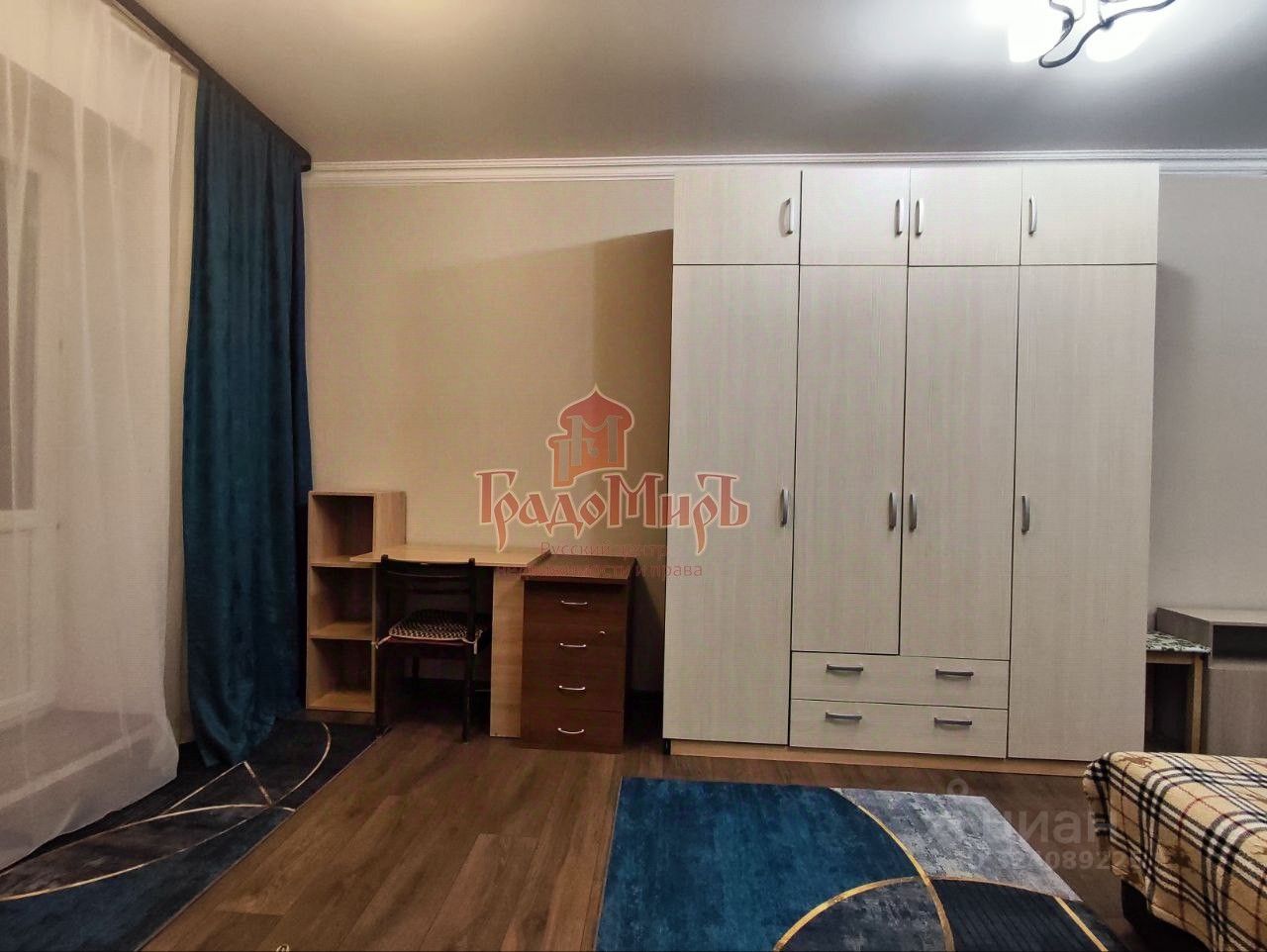 Комната оборудована спальными местами: двуспальный диван и кресло-кровать на одно спальное место. В комнате есть вместительный шкаф для вещей. Новый текстиль (шторы, пледы, полотенца). Проведен интернет.